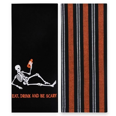 Add a touch of charm to your kitchen with this 2pk Dishtowels Skeleton – Bullseye’s Playground™. Featuring a delightful combination of multi-stripe and solid patterns, these towels come in vibrant orange and black hues. Crafted from cotton with a herringbone woven texture, they offer both style and functionality. Each towel measures 15 inches in width and 25 inches in length, making them perfect for drying dishes or hands.