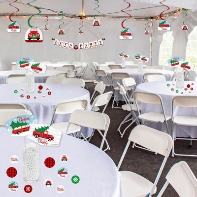 Swirls Includes: 10 total swirls with 2 designs – 5 count per design, that hang with an accordion-style spiral. Professionally printed double-sided, the Merry Little Christmas Tree decoration swirls come with a 5.25″ wide base and a spiral length of about 23″ long. Each decoration swirl comes with a pre-cut hole and clear hooks for easy assembly. Bunting Banner Includes: letter and themed pennants, perfect for your Red Truck Holiday or Christmas Party. Each pennant measures 5″ wide x 7.25″ tall. Pennants are numbered in sequence and ribbon is included for easy assembly. Table Toppers Includes: 10 centerpiece sticks that come with two shape cut-out designs, each professionally printed double-sided. The centerpiece shapes measure 7.5″ wide x 5″ tall. To use as centerpieces or photo props for your Holiday or Christmas Party, assembly stickers are included for the easy DIY required assembly. Circle Confetti Includes: 30 paper circles with 2 different sizes – 10 large circles, size 3.5″ and 20 small circles, size 2.75″. Professionally printed double-sided, the Merry Little Christmas Tree circle confetti can be placed flipped over for added variety. Scatter around your table for a delightful accent. Made in the USA: Merry Little Christmas Tree Decor Galore Party Pack is designed and manufactured at our Wisconsin facility using materials that are Made in the USA.
