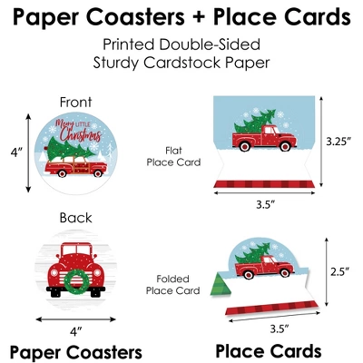 Paper Chargers: Includes 8 scalloped-edge table decorations that are the perfect base for your meal plates. Each place setting charger measures 11.25” in diameter and is a great substitute for a paper doily. They come with a scallop border that can be flared up for an elevated look. Professionally printed double-sided on sturdy cardstock paper, paper chargers are reversible for an alternate look. Napkin Rings: Includes 8 DIY Merry Little Christmas Tree paper napkin rings with tassel-shaped ends. Professionally printed double-sided on sturdy cardstock paper, each napkin ring holder is reversible and measures 2.25” wide by 2.25” tall when assembled. To use, carefully curve each ring without creasing and connect by interlocking the tassel-shaped ends together. Red Truck Drink Tags: Includes 8 paper drink charms that are perfect for accessorizing your drinkware. Each beverage tag is professionally printed double-sided on sturdy cardstock paper with space on the backside for handwritten personalization. Drink tags measure 1.5” wide by 2.75” and will look great on the stem of a glass or on the rim of your cup. Place Cards: Includes 8 Merry Little Christmas Tree name cards that are professionally printed double-sided on sturdy cardstock paper and measure 3.5” wide by 2.5” tall when assembled. To use, push back the top outer edge, revealing the half-circle top. Fold along the pre-scored line in the center to create the tent shape, and then display! Paper Coasters: Includes 8 Red Truck themed reversible circles that perfectly highlight your drinkware. Each beverage coaster is professionally printed double-sided on sturdy cardstock paper and measures 4” in diameter.