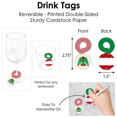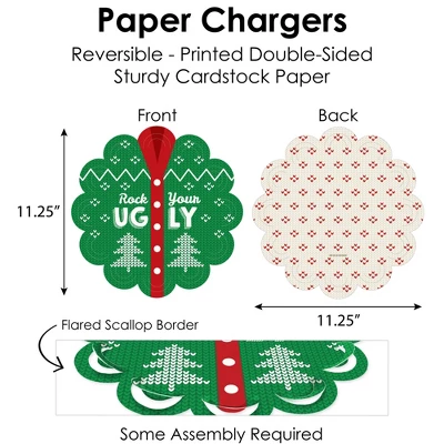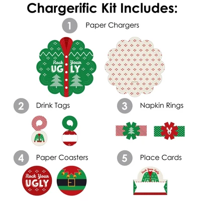 Paper Chargers: Includes 8 scalloped-edge table decorations that are the perfect base for your meal plates. Each place setting charger measures 11.25” in diameter and is a great substitute for a paper doily. They come with a scallop border that can be flared up for an elevated look. Professionally printed double-sided on sturdy cardstock paper, paper chargers are reversible for an alternate look. Napkin Rings: Includes 8 DIY Ugly Sweater paper napkin rings with tassel-shaped ends. Professionally printed double-sided on sturdy cardstock paper, each napkin ring holder is reversible and measures 2.25” wide by 2.25” tall when assembled. To use, carefully curve each ring without creasing and connect by interlocking the tassel-shaped ends together. Tacky Sweater Drink Tags: Includes 8 paper drink charms that are perfect for accessorizing your drinkware. Each beverage tag is professionally printed double-sided on sturdy cardstock paper with space on the backside for handwritten personalization. Drink tags measure 1.5” wide by 2.75” and will look great on the stem of a glass or on the rim of your cup. Place Cards: Includes 8 Ugly Sweater name cards that are professionally printed double-sided on sturdy cardstock paper and measure 3.5” wide by 2.5” tall when assembled. To use, push back the top outer edge, revealing the half-circle top. Fold along the pre-scored line in the center to create the tent shape, and then display! Paper Coasters: Includes 8 Tacky Sweater themed reversible circles that perfectly highlight your drinkware. Each beverage coaster is professionally printed double-sided on sturdy cardstock paper and measures 4” in diameter.