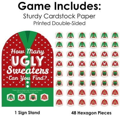 Ugly Sweater Hide and Find Game INCLUDES 1 sign with a built-in stand and 48 hexagon game pieces that you can hide for an exhilarating scavenger hunt at your Holiday and Christmas Party. Easy Assembly: Ugly Sweater game sign comes with built-in stand and requires some easy DIY assembly. To display your sign, fold the sides of the stand towards the center. Then, fold down the support piece of the stand until it rests in the notches. How To Play: Hide and find game sign shows the design of each hexagon piece, so display on a table where everyone can see. Then, find creative places to hide the game pieces around your venue. Finally, send your guests to hunt for the pieces. Whoever finds the most pieces wins! For a twist, divide the guests into teams and assign each team a piece to hunt for. High-Quality Supply: Tacky Sweater Hide and Find Game is professionally printed double-sided on heavy-duty cardstock paper with a photo-like shine. Sign measures 7.5” wide by 11” tall and hexagon pieces measure 2.25” wide by 2.25” tall. Made In The USA: Ugly Sweater Hide and Find Game is designed and manufactured at our Wisconsin facility using materials that are Made in the USA.