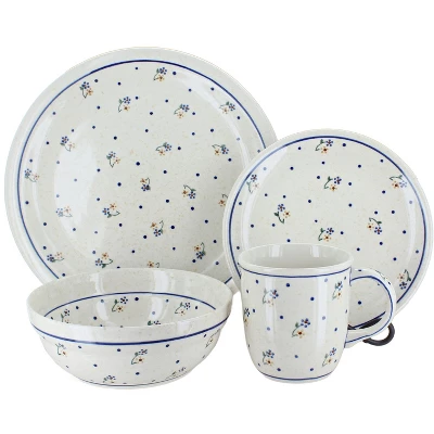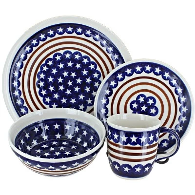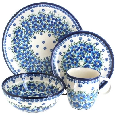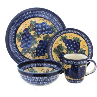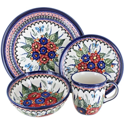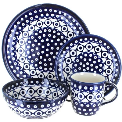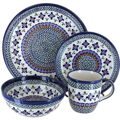 16 Piece Place Setting – includes 4 dinner plate, 4 dessert plate, 4 cereal/soup bowl, and 4 coffee mugDinner Plate – 10.75″ diameterDessert Plate – 7.5″ diameterCereal Bowl – 18 oz. capacity, 6.7″ x 2.6″Coffee Mug – 12 oz. capacity, 3.75″ high The Art of Polish Pottery, as we know it today, started as local folk art centuries ago in the German province of Silesia. The first known pieces of “Bunzlauer” stoneware dating back to the 16th century were crafted by hand and decorated with a folk art stamping technique using potatoes. Original designs were inspired by the peacock feather using the colors of cobalt blue, sage green and ferrous red. These designs and colors are still the inspiration for modern day patterns.Today, skilled Polish artists still individually handcraft and hand decorate each piece using small sponges to stamp each pattern and color. After the process of mixing ingredients, molding the pottery, applying the decorations and glaze, the pottery is twice fired. This process makes the pottery extremely durable, it will not crack or chip easily, and it is perfect for use in the microwave, dishwasher, oven and freezer. Along with our pottery, we have sourced a range of absolutely beautiful hand blown glassware from Poland. It is the perfect addition to your Polish Pottery Collection!