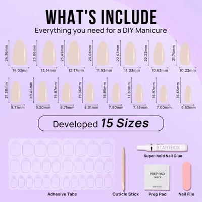 - Shape & Size: Medium Almond, 30 pcs nail tips in 15 sizes