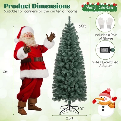 Experience the festive magic with the 4.5/6.5/7.5/9 ft Xmas tree that mirrors the beauty of a blue spruce. The Christmas tree features 256/556/724/1168 branch tips and is made of smell-free PVC. The distinct blue-gray color attracts your guests. Illuminate your space with 100/200/250/500 LED lights that can switch between warm white and colorful tones, offering 9 lighting modes, including C1 steady on, C2 steady on, C1 fade, C2 fade, change slow, C1 flash, C2 flash, change flash, and change twinkle. The 2/3/3/4-section Xmas tree is easy to set up, thanks to the hinged design and folding metal stand, complete with a pair of gloves for safety. The slim pencil shape of the decoration tree is ideal for your home, office, shop, school, and more. More details await your discovery. Merry Christmas!