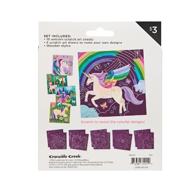 Unicorn Magic Scratch Art. These wonderful scratch-art activity sets are great fun for little artists ages 3-8. Scratch the surface with the wooden stylus to reveal the colorful designs. They can also create their own original masterpieces using the five blank sheets. Each kit includes 10 different illustrated sheets, 5 blank sheets, and wooden stylus. Choking Warning: small parts.