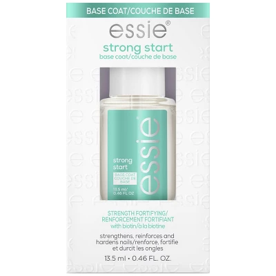 the art of the manicure perfected from america’s nail salon expert: high performance essie top coats, base coats and treatments, for every detail of your manicure, the perfect compliment to any essie nail polish color.bring the salon experience home with essie strong start, our strength boosting formula, infused with biotin, helps reinforce for less weak and brittle feeling nails. the result: a beautiful manicure due to strong nails more resistant to peeling, chipping & breakage.