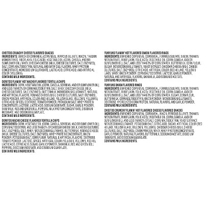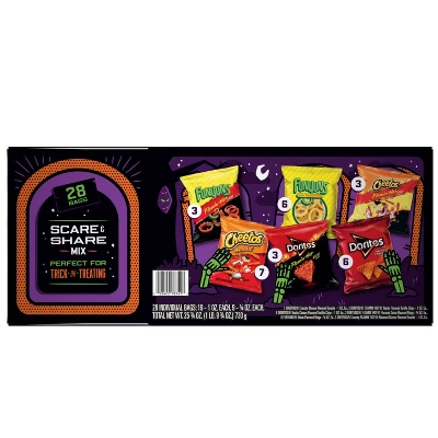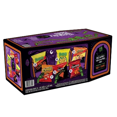 - 28 Coffin Variety Mix Includes: Funyuns Flamin Hot (3), Funyuns Onion Flavored Rings (6) Cheetos Flamin Hot Crunchy (3), Cheetos Crunchy (7), Doritos Flamin Hot Nacho (3) and Doritos Nacho Cheese (6)