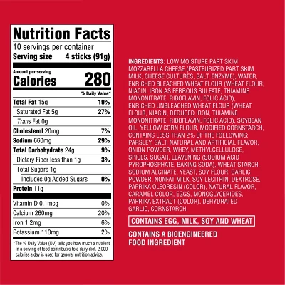 Whether it’s game day, movie night or just time for a snack, frozen Mozzarella Cheese Sticks from market pantry™ are sure to hit the spot. This frozen appetizer pack contains about 10 servings of mozzarella cheese sticks with a tasty breading, resulting in a pleasant and delicious combo of textures — gooey cheese and crisp breading — when the frozen cheese sticks are cooked. Simply pop them in the oven or a deep fryer to fully cook them, then serve with marinara sauce or ranch dressing. The party pack size gives you plenty to serve as an appetizer for a get-together or to treat your family to a cheesy snack a couple days in a row.