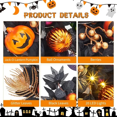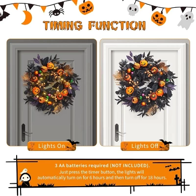 Elevate your Halloween festivities with our stunning Spooky-Chic Halloween Wreath, designed to effortlessly blend eerie charm with playful elegance.Experience the convenience with the built-in auto-timer function. Pre-installed with 20 warm white LED lights, this Halloween door wreath automatically illuminates for 6 hours and turns off for 18 hours, providing a magical glow exactly when you need it without any repeated manual operation. Simply power it with 3 AA batteries (not included), insert them, and let the enchanting atmosphere come to life with zero effort.Crafted from high-quality, durable materials, this wreath is built to last. It retains its vibrant colors and structural integrity year after year, requiring no special cleaning or maintenance. It’s the perfect reusable decoration that will accompany you through many Halloween seasons to come.Versatility meets style with this 20-inch wreath. Its ideal size makes it perfect for hanging on your front door, walls, windows, or for decorating fireplaces and mantels. It seamlessly integrates into any setting, making it an excellent choice for both enhancing daily holiday ambiance and serving as the centerpiece for Halloween parties.We’ve designed this wreath for effortless enjoyment. It arrives ready to use—no complex preparation or tools are needed. Simply unbox, gently fluff the ornaments by hand to restore its full and lively shape, choose your desired spot, and hang it. In moments, your space is transformed with festive spirit, making decor easier than ever.Specifications:Product Dimensions: 20 inches (Diameter)Light Source: 20 Warm White LED LightsPower Source: 3 x AA Batteries (Not Included)Timer Function: Auto 6H On / 18H OffIdeal For: Front Doors, Walls, Windows, Fireplaces, Mantels, Indoor/Outdoor Decor