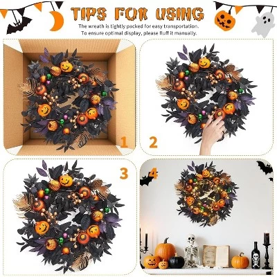 - Unique Design Halloween Wreath: Adorned with black and purple leaves as the base, this lighted Halloween wreath features multiple golden smiling pumpkin decorations, adding a playful touch to the spooky season. The scattered orange, green, and purple spherical ornaments, along with the interspersed golden feathers – like decorations, create a festive yet sophisticated look,making it a must – have for Halloween enthusiasts.