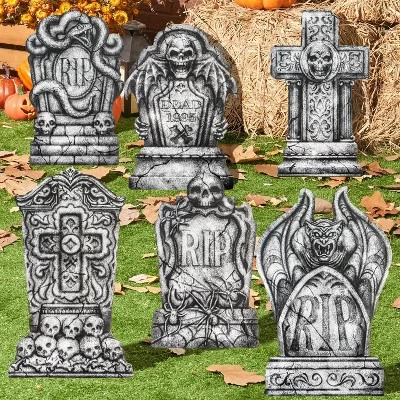 - Our tombstones feature classic Halloween elements like skull cross designs and realistic stone colors, adding an extra dose of creepiness to your outdoor decor. They’re perfect for setting the scene for your Halloween festivities.