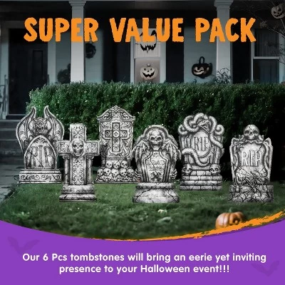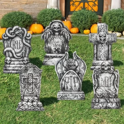- Transform your yard into a haunting graveyard with our tombstones set! This scary outdoor gravestones decoration set includes 6 different tombstones, each standing at 15.7 inches tall, along with 12 metal stakes. Perfect for creating an unforgettable Halloween scene.