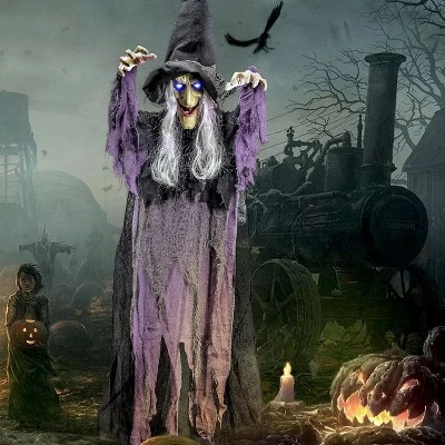 - 72″ Light-Up Talking Hanging Witch. Towering Halloween decoration with eerie illumination and sound effects for maximum scare factor.