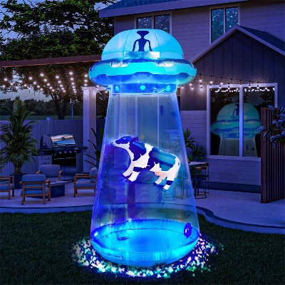 Stand out this Halloween with our spectacular 9-foot-tall inflatable UFO decoration! Designed to be the ultimate party centerpiece, this eye-catching piece features stunning visual effects that will leave your guests in awe. Measuring 4 x 4 x 9 feet (L x W x H), this massive UFO creates an unforgettable presence in any Halloween setup. Take your Halloween decor to the next level with built-in LED lights that cast an eerie glow, transforming your yard or party space into a spine-chilling alien encounter. Whether you’re decorating your front yard, garden, or hosting a Halloween party, this blow-up UFO is the perfect addition. It’s ideal for Outdoor Halloween displays, Trick-or-Treat event decorations, Scary Halloween night setups, Themed party backdrops. Make your home the talk of the neighborhood with this must-have holiday inflatable!