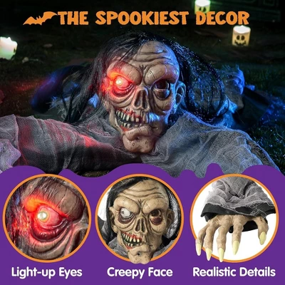 - Crawling Zombie (20.8″x42.5″). This terrifying undead prop features hyper-realistic decayed skin and tattered clothing, emerging from the ground at nearly 4 feet wide. Its gruesome details create instant haunted house vibes.