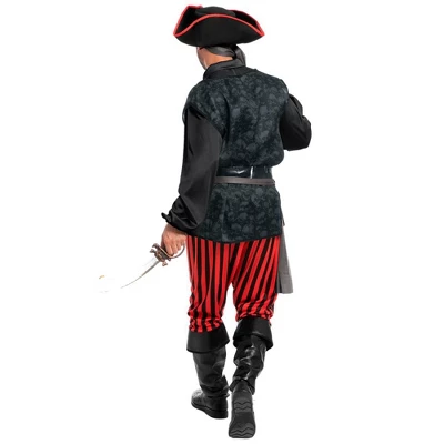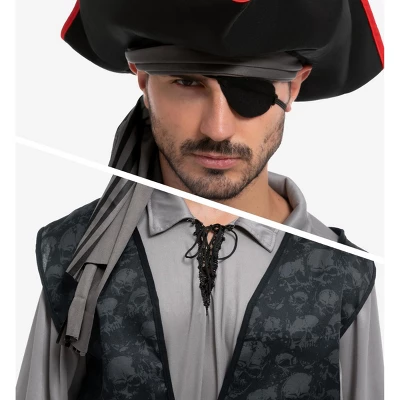 - Complete Pirate Set – Includes a pirate hat, belt, bandana, eye patch, belt sash, beige pirate shirt, vest, and pants for a full Captain Hook-inspired look.