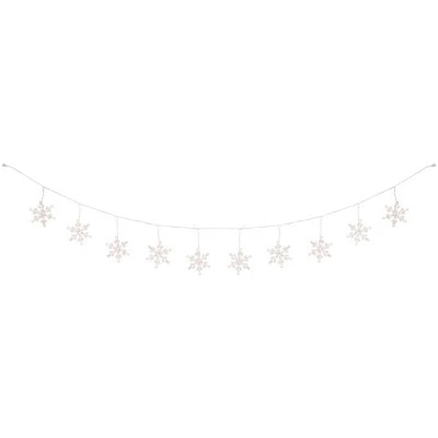 These snowflake lights will brighten your home this holiday in a unique style. Designed with a durable, snowflake-shape and clear bulbs. The twinkling effect adds an extra flair to your displays. These holiday lights are perfect for home, garden, and restaurant decor.Product Features: Color: clear bulbs / white wire Each snowflake has 10 lights Number of bulbs on string: 100 Bulb size: mini Spacing between each snowflakes: 12″Length of drop: 8″Lighted string length: 8.6’Total string length: 10.3’13” white lead cord Additional Product Features:Select lights on snowflakes randomly twinkle to create a shimmering effect If one bulb burns out, the rest will stay lit End-to-end connectors allow you to connect multiple sets together (not to exceed 210 watts) Wire gauge: 22 Comes with replacement bulbs and fuse UL certified and approved for indoor or outdoor use120 volts, 60 hertz, .4 amps, 48 watts Snowflake dimensions: 8″ Material(s): plastic/wire/glass bulbs