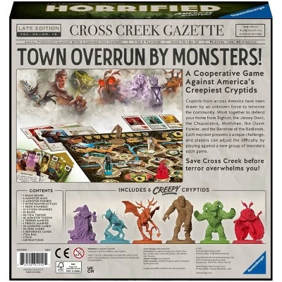 Work together to protect the town of Cross Creek from Bigfoot, the Jersey Devil, Mothman, the Chupacabra, the Ozark Howler, and the Banshee of the Badlands! Each monster requires a different strategy to defeat. Adjust the difficulty by facing different groups of monsters, each represented by a sculpted miniature. Will you be victorious against American’s legendary cryptids?