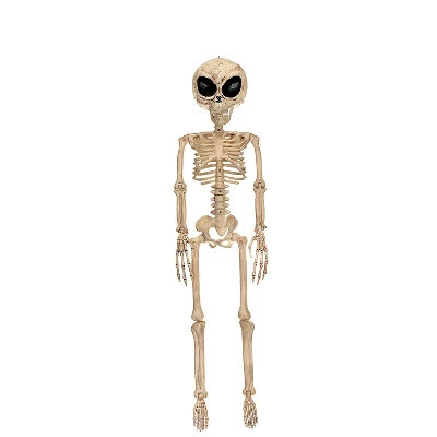 This frighteningly realistic-looking alien skeleton looks like it could have been found in the desert near Area 51. This alien skull features large almond-shaped eyes with small jaw. Detailed Bones. Limbs are posable.