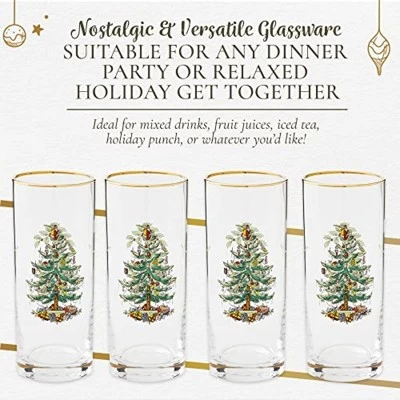 A holiday favorite since its debut in 1938, the Spode Christmas Tree pattern is the epitome of festive elegance and remains the most cherished and widely collected holiday design. Featuring a traditional evergreen adorned with vintage-inspired ornaments and encircled by charming decorations, this pattern evokes a warm, nostalgic Christmas atmosphere that families treasure each year. The iconic tree, decorated with care and surrounded by brightly wrapped presents, brings a whimsical, folksy charm to every piece.Perfect for cozy winter nights or festive gatherings, the Spode Christmas Tree Glass Collection offers a luxurious touch to your favorite cocktail, creating an inviting setting for reconnecting with loved ones. These elegant gold-rimmed glasses are also an ideal choice for serving milk alongside Christmas cookies, making them a delightful addition to your holiday drinkware collection. Pair these glasses with other items from the collection to enhance your seasonal dining experience and create memories that will be cherished. Elevate your festive occasions with the Spode Christmas Tree 15oz Highball Glasses, adorned with gold-rimmed accents and an elegant holiday-themed design, ideal for cocktails at Christmas parties and luxury New Year’s toasts.