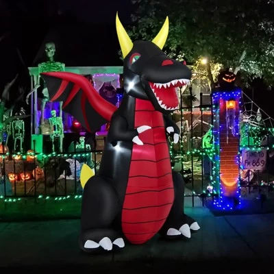 - Dragon Halloween Decoration: This inflatable dragon with a pair of huge wings is sticking its head out and roaring loudly at people. The green eyes, sharp teeth and long tail all create a unique look. This inflatable decoration is a popular symbol of Halloween that will appeal to your family, friends and neighbors.