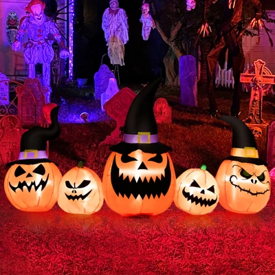 Black and orange are the international colors of Halloween, and the Jack o’lantern is the most classic Halloween decoration. Three big pumpkins wearing wizard’s hats and two smaller pumpkins creates an adorable yard decoration, full of Halloween atmosphere. The reasonable size makes the blow-up pumpkin combo to be a perfect decoration indoors and outdoors. Once plugged in a power socket, it will light up and automatically blow up within 1 minute. Then you can fix it with ground stakes and fastened tethers.